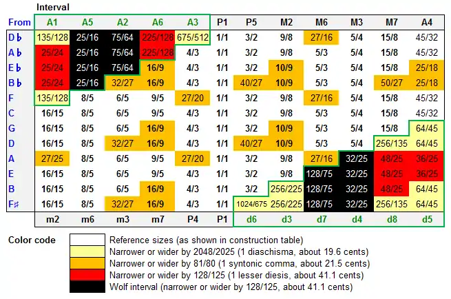 The factors listed in the first row and first column are powers of 3 and 5 respectively (e.g., 19 = 3−2). Colors indicate couples of enharmonic notes with almost identical pitch. The ratios are all expressed relative to C in the centre of this diagram (the base note for this scale). They are computed in two steps: