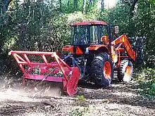 A forestry mulching machine, also referred to as a forestry mulcher, forest masticator, or brushcutter, uses a rotary drum equipped with steel chipper tools ("teeth") or blades to shred vegetation.[1] They are manufactured as application-specific tractors and as mulching attachments (“mulching heads”) for existing tracked and rubber-tired forestry tractors, skid steers, or excavators.