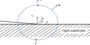 In order to obtain the eigenvalues, the equation above is substituted into the constitutive model, which yields the corresponding nominal stress components. Then, the stresses are substituted into the equilibrium equations (the same formulation as in LEFM theory) and the boundary conditions are applied. The most dominating terms are retained resulting in an eigenvalue problem for and .[4]
