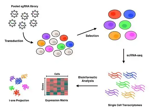 Perturb-seq couples CRISPR mediated gene knockdowns with single-cell gene expression. Linear models are used to calculate the effect of the knockdown of a single gene on the expression of multiple genes.