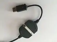 The IBM PC game port first appeared during the initial launch of the original IBM PC in 1981, in the form of an optional US$55 expansion card known as the Game Control Adapter.[8][9] The design allowed for four analog axes and four buttons on one port, allowing two joysticks or four paddles to be connected via a special "Y-splitter" cable.[10]