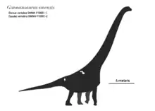 Gannansaurus (meaning "Gannan lizard") is an extinct genus of somphospondylan sauropod dinosaur known from the latest Cretaceous Nanxiong Formation of Ganzhou Basin, Jiangxi Province of southern China. It is known from specimen GMNH F10001 which consists of a single, nearly complete dorsal vertebra and a mid-caudal vertebra. Gannansaurus was first named by Lü Junchang, Yi Laiping, Zhong Hui and Wei Xuefang in 2013 and the type species is Gannansaurus sinensis. Gannansaurus shares some characters with Euhelopus, indicating that it is more closely related to it rather than to other titanosauriforms.[1]