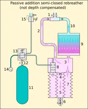 Semi-closed circuit rebreathers (SCRs) used for diving may use active or passive gas addition, and the gas addition systems may be depth compensated. They use a mixed supply gas with a higher oxygen fraction than the steady state loop gas mixture. Usually only one gas mixture is used, but it is possible to switch gas mixtures during a dive to extend the available depth range of some SCRs.[9]