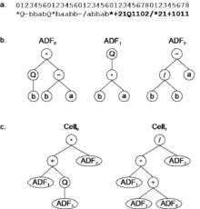 where h is the head's length and nmax is maximum arity. For example, for a gene created using the set of functions F = {Q, +, −, , /} and the set of terminals T = {a, b}, nmax = 2. And if we choose a head length of 15, then t = 15 (2–1) + 1 = 16, which gives a gene length g of 15 + 16 = 31. The randomly generated string below is an example of one such gene: