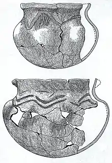 Langford ware was first reported at the Fisher site, and has also been found at the nearby Zimmerman[3][9] and Plum Island[2] sites. It is characterized by grit-tempered, globular vessels with restricted orifice and well-defined shoulders and excurved rim profiles. Surface finish is usually smoothed and decoration, when present, is applied to the neck and shoulder areas and consists of incised and trailed lines, punctates and finger impressions, combined to form arches and festoons. Lugs and loop handles are present on some vessels and nodes are also sometimes present.[1][2][3][9]