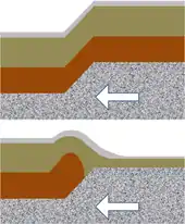 Flow folding: depiction of the effect of an advancing ramp of rigid rock into compliant layers. Top: low drag by a ramp: layers are not altered in thickness; Bottom: high drag: lowest layers tend to crumple.[20]