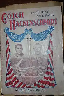 Hackenschmidt and Gotch met again on 4 September 1911, at the newly opened Comiskey Park in Chicago, which drew a crowd of nearly 30,000 spectators and a record gate of $87,000. The rematch is one of the most controversial and talked about matches in professional wrestling history, as Hackenschmidt claimed to have injured his knee against Roller, his chief training partner. Years later, professional wrestler Ad Santel told Lou Thesz that he was paid $5,000 by Gotch's backers to cripple Hackenschmidt in training, and make it look like an accident.[22] However, according to Hackenschmidt himself, the injury was accidentally inflicted by his sparring partner, Roller, when trying to hold Hackenschmidt down onto his knees in the down position. Roller's right foot struck Hackenschmidt's right knee, which in 1904 had developed "Housemaid's Knee", requiring treatment, and had acted up again in 1907. Furthermore, according to Hackenschmidt, his sparring partners for this match were Americus (Gus Schoenlein), Jacobus Koch, Wladek Zbyszko and Dr. Roller. Ad Santel is not mentioned in any account of Hackenschmidt's training by either Hackenschmidt or Roller, both of whom offered their insights and accounts.[23]