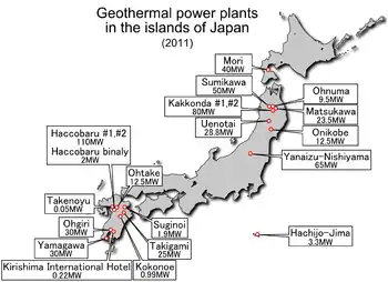 As of 2003, 20 geothermal power plants are in operation at 18 locations in Japan.[2][7][8]