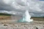 Eventually the water remaining in the geyser cools back to below the boiling point and the eruption ends; heated groundwater begins seeping back into the reservoir, and the whole cycle begins again. The duration of eruptions and time between successive eruptions vary greatly from geyser to geyser; Strokkur in Iceland erupts for a few seconds every few minutes, while Grand Geyser in the United States erupts for up to 10 minutes every 8–12 hours.[8]