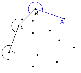 The gift wrapping algorithm begins with i=0 and a point p0 known to be on the convex hull, e.g., the leftmost point, and selects the point pi+1 such that all points are to the right of the line pi pi+1. This point may be found in O(n) time by comparing polar angles of all points with respect to point pi taken for the center of polar coordinates. Letting i=i+1, and repeating with until one reaches ph=p0 again yields the convex hull in h steps. In two dimensions, the gift wrapping algorithm is similar to the process of winding a string (or wrapping paper) around the set of points.