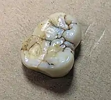 Gigantopithecus molars have a high cavity rate of 11%, which could mean fruit was commonly included in its diet.[3][24] The molars from Gigantopithecus Cave frequently exhibit pitting enamel hypoplasia, where the enamel improperly forms with pits and grooves. This can be caused by malnutrition during growth years, which could point to periodic food shortages, though it can also be induced by other factors.[24] Specimen PA1601-1 from Yanliang Cave shows evidence of tooth loss of the right second molar before the eruption of the neighboring third molar (which grew slantedly), which suggests this individual was able to survive for a long time despite impaired chewing abilities.[8]