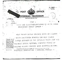 Telegram sent by Cardinal Eugenio Pacelli (the future Pius XII) on behalf of Pope Pius XI to the people of England following the death of Chesterton