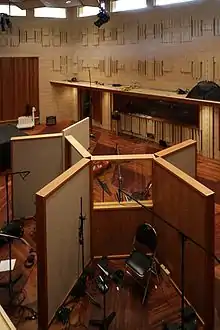 A gobo typically consists of a wooden panel covered with foam, carpeting or other materials with sound damping properties. A gobo can rest directly on the floor or be raised on adjustable legs.