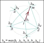 Gradient ∇hi on a network: ∇hi(i, μ(i)) i.e. the directed edge from i to μ(i), where μ(i) ∈ Si(1) ∪ {i}, and hμ has the maximum value in .