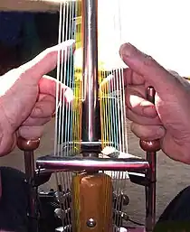 Grawi originally desired an instrument on which he could play polyrhythms more easily than on the guitar, and he refined the Gravikord's design over several years to meet this goal. The first prototype, made in 1974, was acoustic, and had a bamboo and fiberglass basket resonator with an animal skin head and a large bamboo neck. These first Gravikords already differed from the kora by having the tuning mechanisms removed from the neck and placed at the base, and an extensively re-designed bridge which also incorporated a kalimba that could be played simultaneously with the strings. Their tuning also differed, as they had 25 strings that were tuned symmetrically using a variation of the Hugh Tracey kalimba tuning system. Grawi made several unique prototypes during this period using wood, aluminum, and other materials, with features including stereo output and variable pitch,[2] and finally patented the Gravikord in 1984.[1] In the finished Gravikord, the body is made entirely of welded stainless steel tubing. There is no resonator; the tones of the twenty-four strings are amplified by a piezo-electric pickup in the bridge, and the instrument is made for natural and comfortable playing in a sitting or standing position.[3]