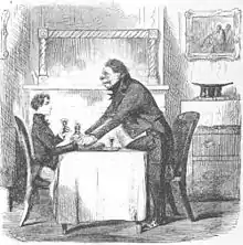 Dickens, whose health was not the best, felt "The planning from week to week was unimaginably difficult" but persevered.[39] He thought he had found "a good name", decided to use the first person "throughout", and thought the beginning was "excessively droll": "I have put a child and a good-natured foolish man, in relations that seem to me very funny".[41] Four weekly episodes were "ground off the wheel" in October 1860,[42] and apart from one reference to the "bondage" of his heavy task,[43] the months passed without the anguished cries that usually accompanied the writing of his novels.[39] He did not even use the Number Plans or Mems;[N 2] he had only a few notes on the characters' ages, the tide ranges for chapter 54, and the draft of an ending. In late December, Dickens wrote to Mary Boyle that "Great Expectations [is] a very great success and universally liked".[10]