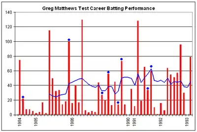 When Australian cricket was in the doldrums in the 1980s "his dashing batsmanship and growing ability as a spin bowler suddenly elevated Matthews to a position of a national hero".[2] He made centuries in times of crisis against New Zealand and India in 1985–86, took ten wickets in the Tied Test at Madras and batted well against England in 1986–87.
