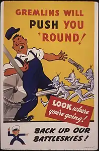 A gremlin is a mischievous folkloric creature invented at the beginning of the 20th century to originally explain malfunctions in aircraft, and later in other machinery, processes, and their operators. Depictions of these creatures vary widely. Stories about them and references to them as the causes of especially inexplicable technical and mental problems of pilots were especially popular during and after World War II.[1][2]