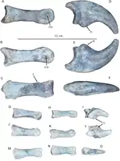 Like the well-known Tyrannosaurus, to which it has been compared, the 6–7 m (20–23 ft) Gualicho possesses reduced arms and possibly two fingered hands, although a 2020 study suggests enough of the third metacarpal is present for a third finger.[4] If it is an Allosauroid, this finding indicates that carnosaurs may have been subject to the same evolution of limb-reduction as tyrannosaurids and abelisaurids.[5]