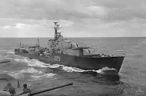 Algonquin was modernized to a Type 15 frigate at Esquimalt and recommissioned on 25 February 1953 with the hull number 224. She was not selected for duty in the Korean War and was instead posted to CFB Halifax on the North Atlantic coast where she spent much of the next 14 years working with Canada's NATO allies.[5] The First Canadian Escort Squadron came into being on 10 November 1953 as part of Atlantic Command with Algonquin as its flagship. The squadron was initially composed of Algonquin and the Prestonian-class frigates Lauzon, Prestonian and Toronto.[33] In September the First Canadian Escort Squadron took part in the NATO naval exercise "New Broom II" and in October "Morning Mist" before performing a two-month training cruise in the Mediterranean Sea, making several port visits.[34][35] The squadron returned to Canada on 10 December 1954.[35] In January 1958, Algonquin collided with HMCS Nootka while operating in the Atlantic with the First Canadian Escort Squadron.[36]