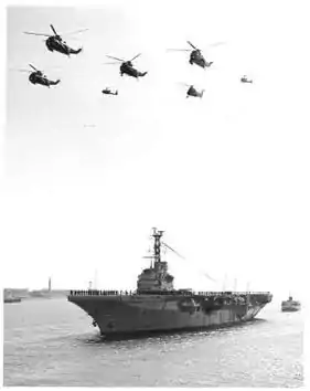 In 1956, Bulwark took part in her first combat operation, during the Suez Crisis, when she launched up to 600 sorties in what was then known as Operation Musketeer.[1] On 13 September 1958, Bulwark was exercising with the frigate Loch Killisport in the Gulf of Oman when the tankers SS Melika and Fernand Gilabe collided in the Persian Gulf and caught fire, the tankers' crews abandoning ship. Bulwark went to the aid of the two blazing tankers, with her helicopters landing fire fighting parties onto the tankers. Bulwark, with the aid of the frigate Puma, towed Melika, to Muscat. Bulwark's Whirlwind helicopter squadron, 845 Naval Air Squadron, was awarded the Boyd Trophy for the squadron's role in the rescue.[1][2]