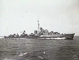During the Battle of Sept-Îles, Rocket encountered German torpedo boats in the English Channel in October 1943, an action in which the cruiser Charybdis and destroyer Limbourne were lost. The latter was sunk by Rocket after she became disabled, to avoid her falling into enemy hands. On 29 November 1943 Rocket and HMS Tumult depth-charged and sank the German submarine U-86 east of the Azores in position 40°52′N 018°54′W.[2] Arriving in the Indian Ocean in January 1944, Rocket participated in the shelling of Sabang (25 July 1944) and of the Andaman Islands (February and March 1945).