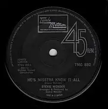 "He's Misstra Know-It-All" is a single by Stevie Wonder for the Tamla (Motown) label, from his Innervisions album, which reached number 10 on the UK Singles Chart in April 1974.[2] The song takes the form of a mellow ballad with a steady beat, principally a solo performance with Wonder providing lead vocal, background vocal, piano, drums, handclaps and congas. Ethereal flute-like sounds are provided by his TONTO modular synthesiser. Willie Weeks, on electric bass, is the only other musician. Towards the end of the song the mood changes to a stronger feel, more strident singing and with hand-claps emphasising the beat, half-beat and quarter-beat.