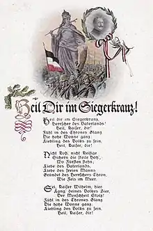 "Heil dir im Siegerkranz" (pronounced [ˈhaɪ̯l diːɐ̯ ʔɪm ˈziːɡɐkʁant͡s]; German for "Hail to Thee in the Victor's Crown", literally: "Hail to Thee in the Victor's Wreath") was the Kaiserhymne (imperial anthem) of the German Empire from 1871 to 1918 and royal anthem of Prussia from 1795 to 1918.[1]