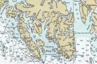 Hetta Inlet is a deep embayment in the southwestern coast of Prince of Wales Island in the U.S. state of Alaska. It connects with the Pacific Ocean through Cordova Bay. The head of the inlet is separated by a 200 feet (61 m) divide from the West Arm of Cholmondeley Sound. The shores are abrupt from the water's edge, and the channels and inlets are deep. The precipitation is probably a little greater than at Ketchikan, and the mean annual temperature is slightly higher. The white crystalline limestone of the Wales series, striking nearly north and south, is the predominant country rock of Hetta Inlet. In it are intruded many igneous rocks, some schistose, some massive. The white limestones are closely folded and have great variation in dip. The igneous rocks, so far as determined from the small collection made, include gabbros, diorites, amphibolites, diabases, and pyroxene-syenites. All these are comparatively massive. The greenstoneschists, which occupy considerable areas, are chloritic.[1]