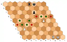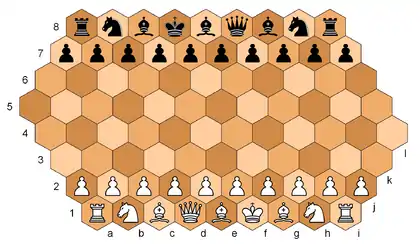 The game is played on a vertically oriented regular hexagonal board with sides 6 cells long, which has 91 hex cells having three colours (light, dark, and mid-tone), with the middle cell (or "hex") usually mid-tone.[5] The usual set of chess pieces is increased by one bishop and one pawn. The board has 11 files, marked by letters al (letter j is not used), and 11 numbered ranks (which bend 60° at file f). Ranks 1–6 each contain 11 cells, rank 7 (filled with black pawns in the initial setup) has 9 cells, rank 8 has 7, and so on. Rank 11 contains exactly one cell: f11.
