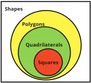 A square can always also be referred to as a quadrilateral, polygon or shape. In this way, it is a hierarchy. However, consider the set of polygons using this classification. A square can only be a quadrilateral; it can never be a triangle, hexagon, etc.