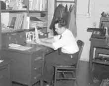 Engineer using a slide rule, with mechanical calculator in background, mid 20th century