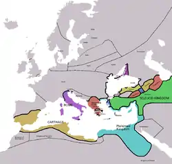 These eastern powers soon began to be overshadowed by those farther west. In North Africa, the former Phoenician colony of Carthage rose to dominate its surroundings with an empire that contained many of the former Phoenician holdings. However, it was a city on the Italian Peninsula, Rome, that would eventually dominate the entire Mediterranean basin. Spreading first through Italy, Rome defeated Carthage in the Punic Wars, despite Hannibal's famous efforts against Rome in the Second Punic War.