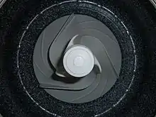 An open impeller has a hub with attached vanes and is mounted on a shaft. The vanes do not have a wall, making open impellers slightly weaker than closed or semi-closed impellers. However, as the side plate is not fixed to the inlet side of the vane, the blade stresses are significantly lower.[4] In pumps, the fluid enters the impeller's eye, where vanes add energy and direct it to the nozzle discharge. A close clearance between vanes and pump volute or back plate prevent most of fluid from flowing back. Wear on the bowl and edge of vane can be compensated by adjusting the clearance to maintain efficiency over time. [5] Because the internal parts are visible, open impellers are easier to inspect for damage and maintain than closed impellers. They can also be more easily modified to change flow properties. Open impellers operate on a narrow range of specific speed. Open impellers are usually faster and easier to maintain. For small pumps and those dealing with suspended solids, open impellers are generally used.[6] Sand locking does not occur as easily as with closed type.