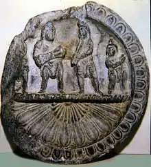 Jain Kankali Tila tablet of Sodasa or "Amohini relief", inscribed "in the reign of Sodasa", circa 15 CE. State Museum Lucknow, SML J.1[28]