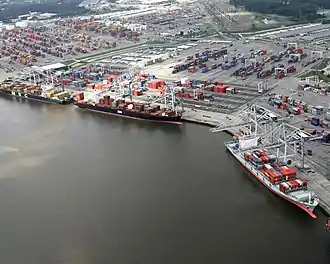 Charleston Harbor, South Carolina, regularly hosts ships traveling through the recently expanded Panama Canal. South Carolina is also home to many manufacturing plants belonging to various multinational corporations, such as the automaker BMW, the tire maker Michelin, and many others.[78] Works to deepen it to 52 feet (15.8 m) has been ongoing since 2011 but had never been on a federal budget proposed by the President till 2018, when a new cost-benefit analysis conducted by the U.S. Army Corps of Engineers made it suitable for consideration. President Trump allocated $138 million (~$145 million in 2021) to the project in his budget in 2019. Dredging started in 2018, and the State Ports Authority, which operates Charleston Harbor, said it planned to complete the project by 2021, in time for a new container terminal to open.[79] Upon completion, it will be the deepest shipping channel in the East Coast of the United States.[78]