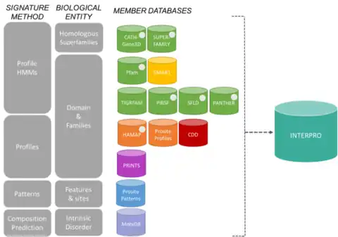 The 13 member databases of the InterPro consortium grouped by their signature construction method and the biological entity they focus on.[6] - PIRSF