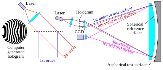 The latest proposed extremely large astronomical telescopes, such as the Thirty Meter Telescope and the Extremely Large Telescope, will be of segmented design. Their primary mirrors will be built from hundreds of hexagonal mirror segments. Polishing and figuring these highly aspheric and non-rotationally symmetric mirror segments presents a major challenge. Traditional means of optical testing compares a surface against a spherical reference with the aid of a null corrector. In recent years, computer-generated holograms (CGHs) have begun to supplement null correctors in test setups for complex aspheric surfaces. Fig. 15 illustrates how this is done. Unlike the figure, actual CGHs have line spacing on the order of 1 to 10 μm. When laser light is passed through the CGH, the zero-order diffracted beam experiences no wavefront modification. The wavefront of the first-order diffracted beam, however, is modified to match the desired shape of the test surface. In the illustrated Fizeau interferometer test setup, the zero-order diffracted beam is directed towards the spherical reference surface, and the first-order diffracted beam is directed towards the test surface in such a way that the two reflected beams combine to form interference fringes. The same test setup can be used for the innermost mirrors as for the outermost, with only the CGH needing to be exchanged.[63]