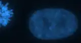 An image of the nucleus of a cell (HT1080) currently in interphase (likely G1). Note: Cytoplasm of this cell or the neighboring cell is not visible (top-left), which is currently in the telophase of mitosis. Image taken using an optical microscope and DAPI staining of DNA.
