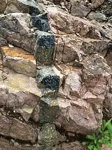 Intrusive contacts are the surfaces between host (or country) rock and an intrusive magmatic body.[3] The older country rock is crosscut by a younger magmatic body. The nature of the intruding body depends on its composition and depth. Common examples are igneous dikes, sills, plutons, and batholiths. Depending on the composition of the magma, the intrusive body may have a complex internal structure which can provide insight into its emplacement.
