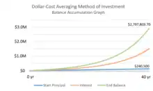 Dollar cost averaging: If an individual invested $500 per month into the stock market for 40 years at a 10% annual return rate, they would have an ending balance of over $2.5 million.