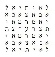 Occultist Arimanius Théletos, who created the Magic Square of Ithiel,[6] has used it to derive an evocation of Ithiel that can be used in magic ritual. The words of the evocation are Hebrew renderings of phrases drawn from the Magic Square of Ithiel. It begins with the palindrome “le-Ithiel” (לְאִיתִיאֵל), meaning "to Ithiel" which can be read along each side of the magic square. Other phrases such as “Abba” (father) and “yomar” (he will say) are also encoded within the cryptic message of the cipher. Each other palindrome inside the magic square form barbarous names, which are corrupted names of deities particularly used in magical evocations.[7] According to Rosemary Guiley barbarous names are used "to command all spirits of the firmament, ether, and the elements."[8]