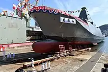 The 30DX design has an overall length of 130 m, breadth of 16 m, a standard displacement of 3900 tons with a full load displacement of about 5500 tons, and a maximum speed of over 30 knots.[4] Weapons include a Mk 45 gun, two remote weapon station above the bridge, 16 Mk 41 VLS at the bow, 8 anti-ship missiles, one SeaRAM, an SH-60Lhelicopter, torpedoes, and decoy launchers. It can also deploy and recover UUV, USV, and sea mines from the rear ramp beneath the helideck.[5] It is also expected to use a naval version of the Type 03 Chū-SAM.[6]