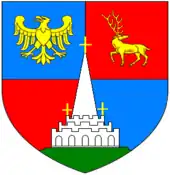 1. Arms as depicted in a 1794 stained glass image in Shute Church of the arms of George Templer of Shapwick. These differ in several details from the official grant of 1765 registered in the College of Arms: Quarterly azure and gules, on a mount in base vert the perspective of an antique temple argent of three stories, each embattled; from the second battlement two steeples, [sic] and from the top, one, each ending in a cross sable [sic] on the pinnacle; in the first quarter an eagle displayed; in the second a stag trippant regardant or.[1]