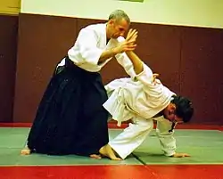 An aikidoka applying a wristlock and armlock combination as a pain compliance hold