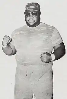 He later formed a duo with Ed Gantner, known as the Shock Troops, working for the CWF.[3] On November 25, 1986 Canty, while still working as Kareem Muhammad, defeated Barry Windham to win the NWA Florida Heavyweight Championship, holding it until December 2 where he lost it to Ron Simmons.[17] He later teamed up with Hacksaw Higgins to win the NWA United States Tag Team Championship, although the duo only held it for a day.[13] In late 1986 Candy worked a tour with New Japan Pro-Wrestling under the ring name "Super Mario Man", a moniker that seemed more appropriate for an Italian plumber than a 6 ft 5 in (1.96 m), 410 lb (190 kg) African American wrestler.[1][18] In 1987 he travelled to Puerto Rico, working for the World Wrestling Council (WWC) where he won the WWC Puerto Rico Heavyweight Championship on June 6from Mighty Igor, holding it for about six months before losing it to Miguel Perez, Jr.[19] In 1988 he took the ring name "Commando Ray", teaming with "Commando Boone" (AKA Grizzly Boone) to for a team known as "The Commandos.[3] Candy's last major match was at the 1988 Starrcade, where he was a part of a Bunkhouse Battle royal, a match that was only seen by the audience in the Norfolk Scope.[20]