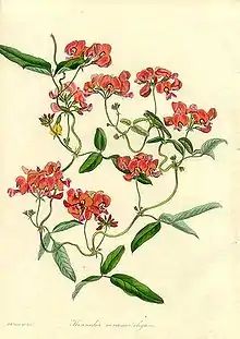 This species was first formally described in 1794 by William Curtis who gave it the name Glycine coccinea in his Botanical Magazine from plants raised "in the neighbourhood of London from Botany-Bay seeds".[7][8] In 1805, Étienne Pierre Ventenat changed the name to Kennedia coccinea in his book Jardin de la Malmaison.[9] The specific epithet (coccinea) means "scarlet".[10]