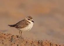 The Kentish plover (Charadrius alexandrinus) is a small wader (40-44 g) of the family Charadriidae that breeds on the shores of saline lakes, lagoons, and coasts, populating sand dunes, marshes, semi-arid desert, and tundra.[2][3] Both male and female birds have pale plumages with a white underside, grey/brown back, dark legs and a dark bill; however, additionally the male birds also exhibit very dark incomplete breast bands, and dark markings either side of their head, therefore the Kentish plover is regarded as sexually dimorphic.[4]