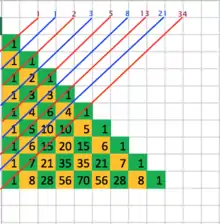 • If the rows of Pascal's triangle are left-justified, the diagonal bands (colour-coded below) sum to the Fibonacci numbers.