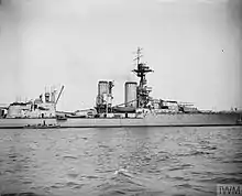 Training exercises had shown that destroyer and torpedo boats attacked more frequently from the frontal arc, so the sixteen 50-calibre BL four-inch (100 mm) Mark VII guns of the secondary armament was re-arranged to improve fire distribution ahead. Eight of these were mounted in the forward superstructure, four in the aft superstructure, and four in casemates in the side of the hull abreast of the forward main gun turrets, all in single mounts. The guns in the hull casemates were frequently unusable in heavy seas and were later removed during the war. The Mark VII guns had a maximum elevation of +15° which gave them a range of 11,400 yards (10,424 m). They fired 31-pound (14.1 kg) projectiles at a muzzle velocity of 2,821 ft/s (860 m/s).[7] They were provided with 150 rounds per gun. Four 3-pounder (1.9 in [47 mm]) saluting guns were also carried. The ships were equipped with three 21-inch submerged torpedo tubes, one on each broadside and another in the stern, for which 14 torpedoes were provided.[2]